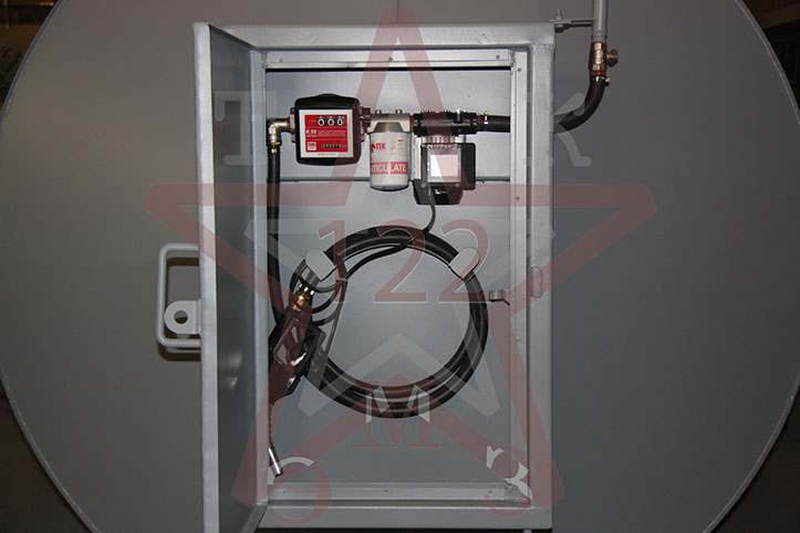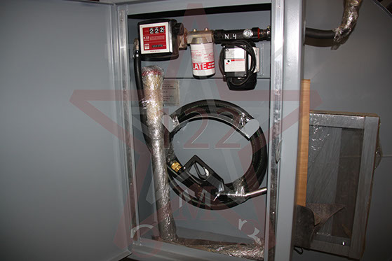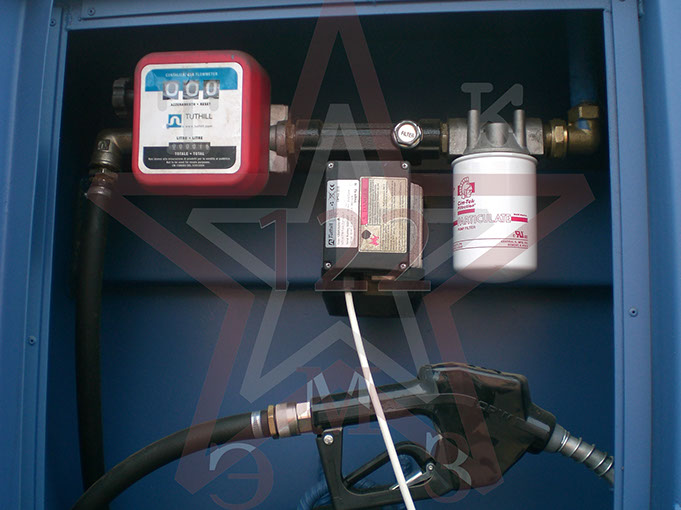 Оборудование топливораздачи состоит из топливораздаточного пистолета, оборудованного гибким маслобензостойким шлангом длиной 6м (возможна комплектация с длинами до 15м), электронасоса (возможна комплектация с ручным насосом), механического счетчика, и сменного фильтра для тонкой очистки топлива, который расположен в стальном специальном шкафу.